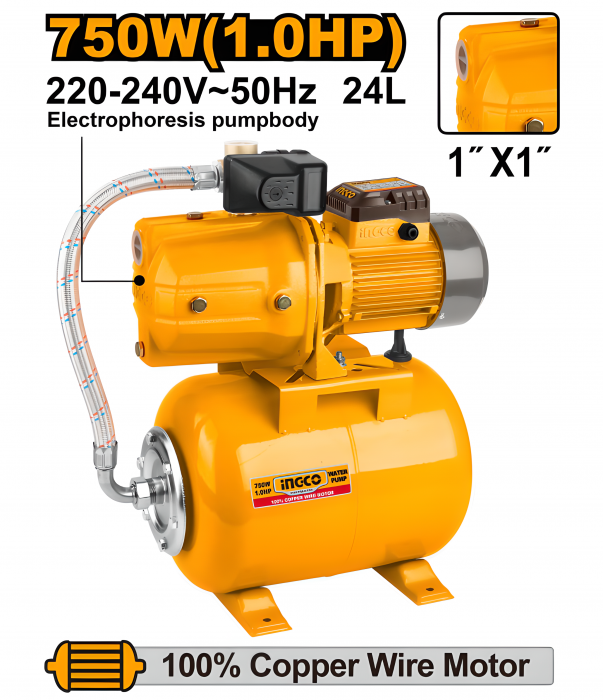Hidrofor INGCO 750W, cu vas de 24L, pompă din fontă, turbină din bronz și accesorii incluse – ideal pentru alimentarea cu apă în gospodării și aplicații de grădinărit.
