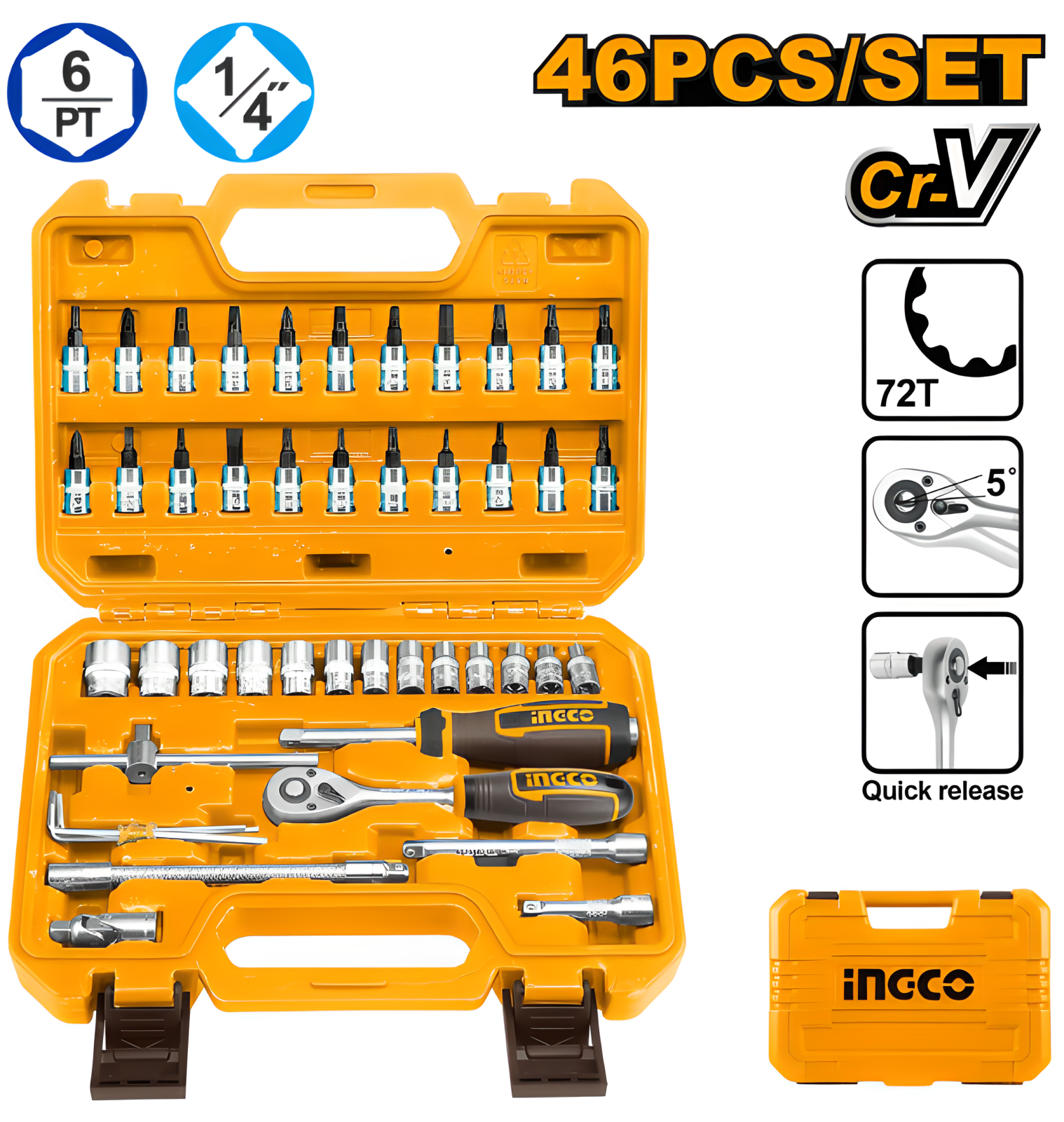 Clichetul rapid cu 72 de dinți permite o manevrare precisă și eficientă, chiar și în spații înguste. Cheile tubulare acoperă dimensiuni de la 4 mm la 14 mm, iar prizele pentru biți includ variante hexagonale, torx, plate, cruciforme și pozidriv, acoperind cele mai frecvente nevoi de intervenție.